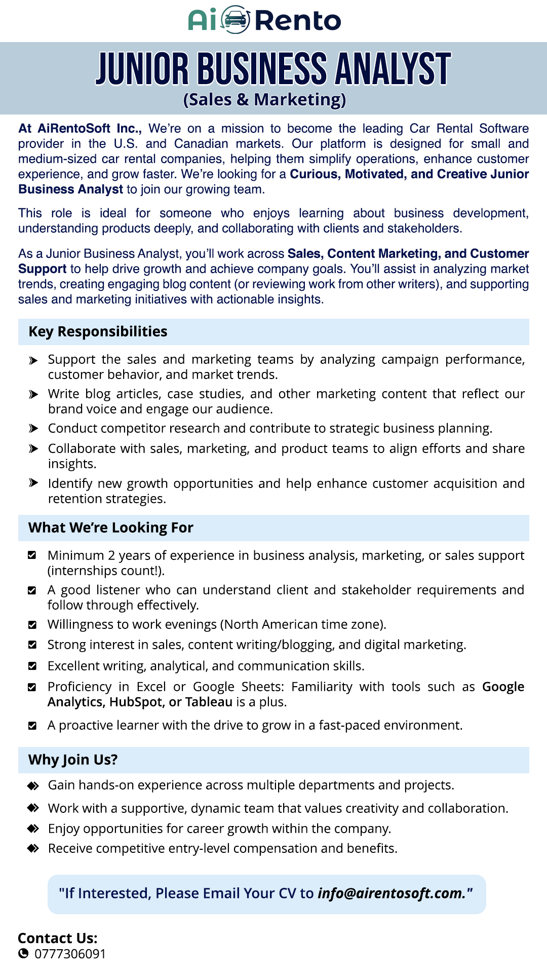 Join AiRentoSoft Inc. as a Junior Business Analyst to support sales, marketing, and customer success initiatives. This role is ideal for someone curious, motivated, and creative who enjoys analyzing business performance, understanding products, and collaborating with clients and internal teams to drive growth.